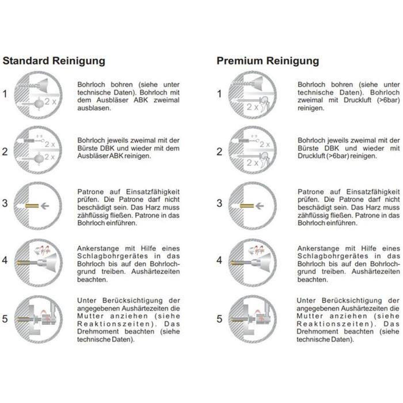 | ✔ Wirkungsweise: Die Verbundankerpatrone besteht aus einem Glasrohr das mit einer Harzmischung, grobem Quarzsand und einem mit Härterpulver gefüllten Innenrohr konfektioniert ist. Die Ankerstange wird mittels eines Bohrgerätes in das Bohrloch schlagend, drehend eingeführt. Bei diesem Vorgang werden die Glasrohre zerstört, der Quarzsand zermahlt die Glasssplitter und das Harz wird mit dem Härter homogen vermischt. Das Gemisch füllt den Raum zwischen dem Befestigungselement und der Bohrlochwand aus. Nach Aushärten des Gemisches kann das Befestigungselement mit der angegebenen Last beansprucht werden. |